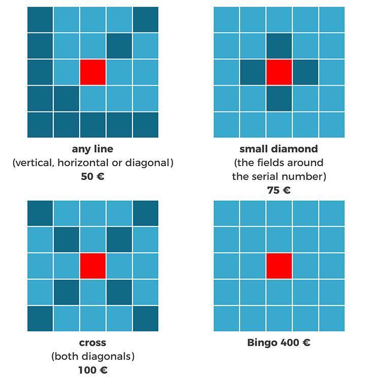 The first player to cover one of the winning combinations must inform the bingo caller thereof immediately. In case of more winners, the prize shall be split among them equally.
