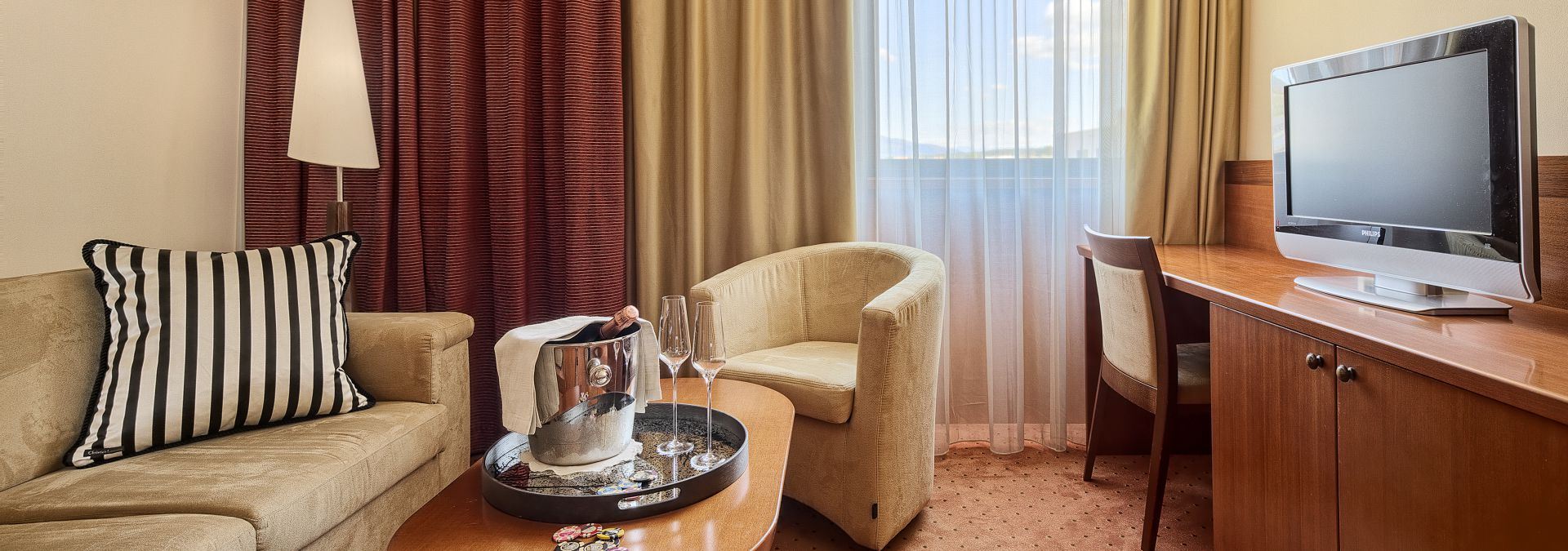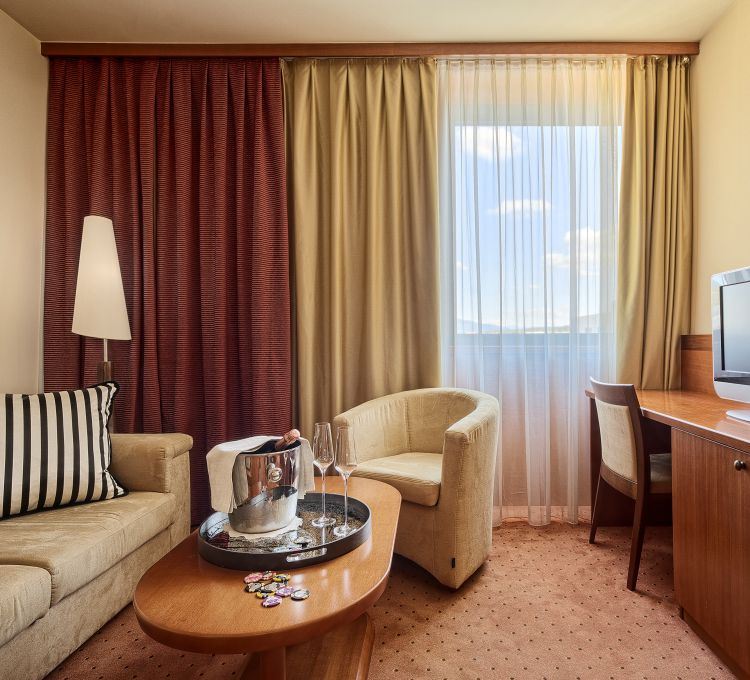 The Classic Suite offers a comfortable and pleasant stay for up to 2 guests. The room is equipped with a double bed or two separate beds, and the bathroom features a shower. Adjacent to the room is a separate living area with a sofa, coffee table, and workspace. You have access to free Wi-Fi, free use of the pool complex and gym, and free parking in the garage. A rich buffet breakfast is included in the price, and room service is available 24 hours a day.