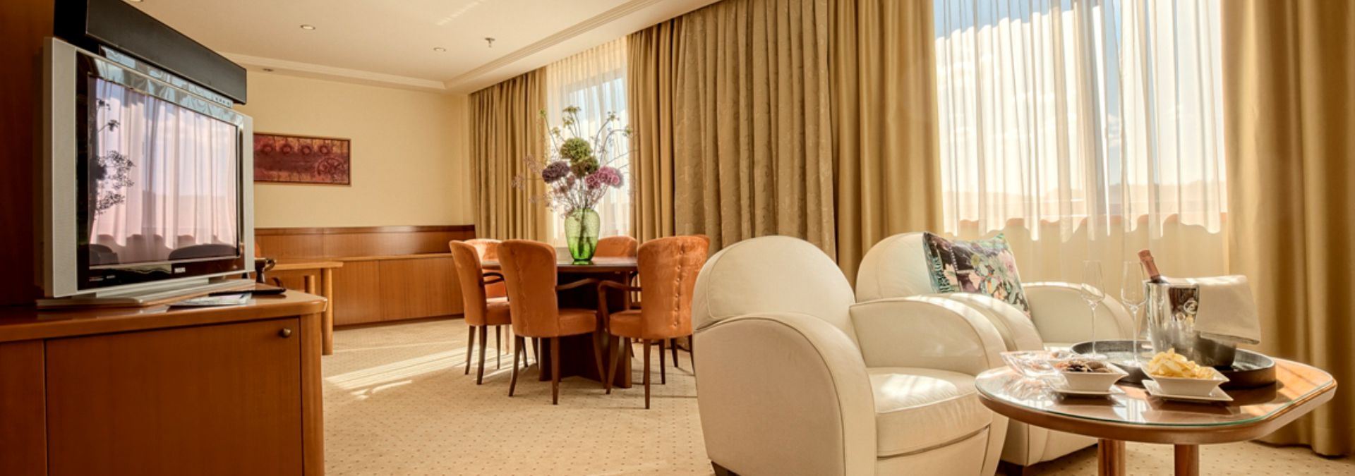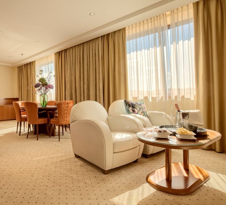 The luxurious Lux Suite offers the highest level of comfort and intimacy. The sleeping area has 2 separate beds or a double bed, and the bathroom features a massage bathtub, luxurious bathroom amenities, a shower, a bidet, and an additional separate toilet. The spacious living area includes a sofa and armchairs, as well as a large dining table and workspace. You have access to free Wi-Fi, free use of the pool complex and gym, and free parking in the garage. A rich buffet breakfast is included in the price, and room service is available 24 hours a day.